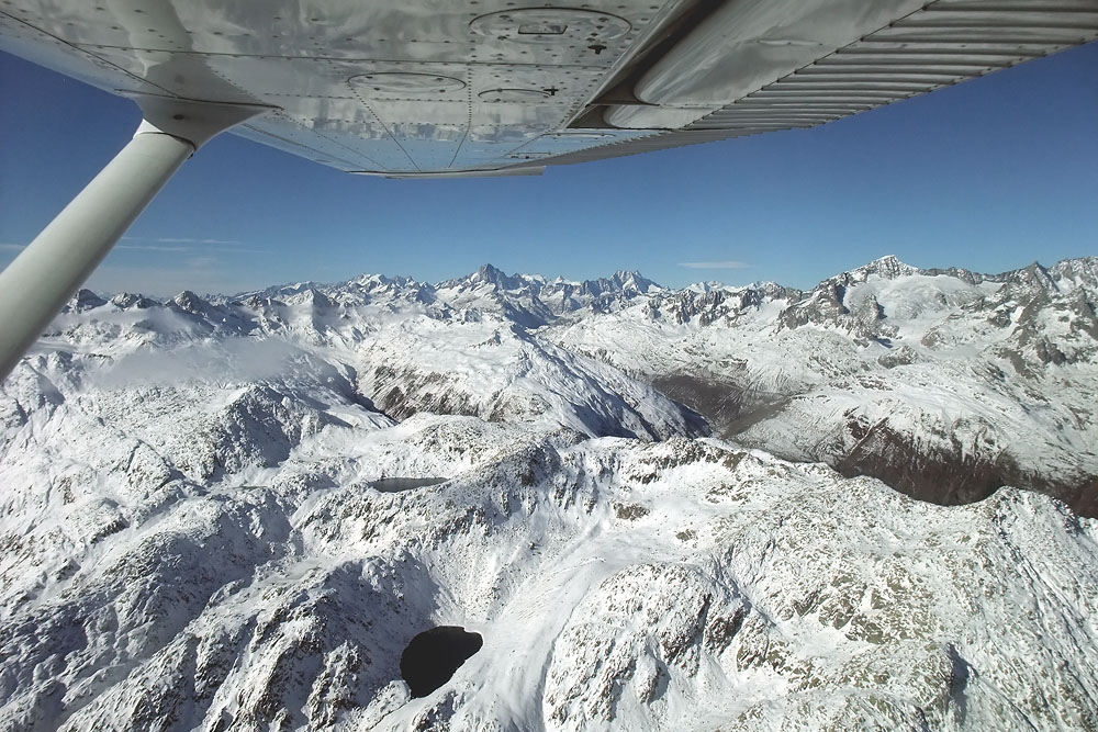 Herrliche Sicht auf die Schneeberge – ein Anblick, der mir immer wieder einen Glücksseufzer abverlangt 🙂 Wir überfliegen gerade den Gotthardpass, Blickrichtung Furkapass. Im Vordergrund der Pizzo d’Orsirora (2603müM) und die gleichnamigen Seelein.