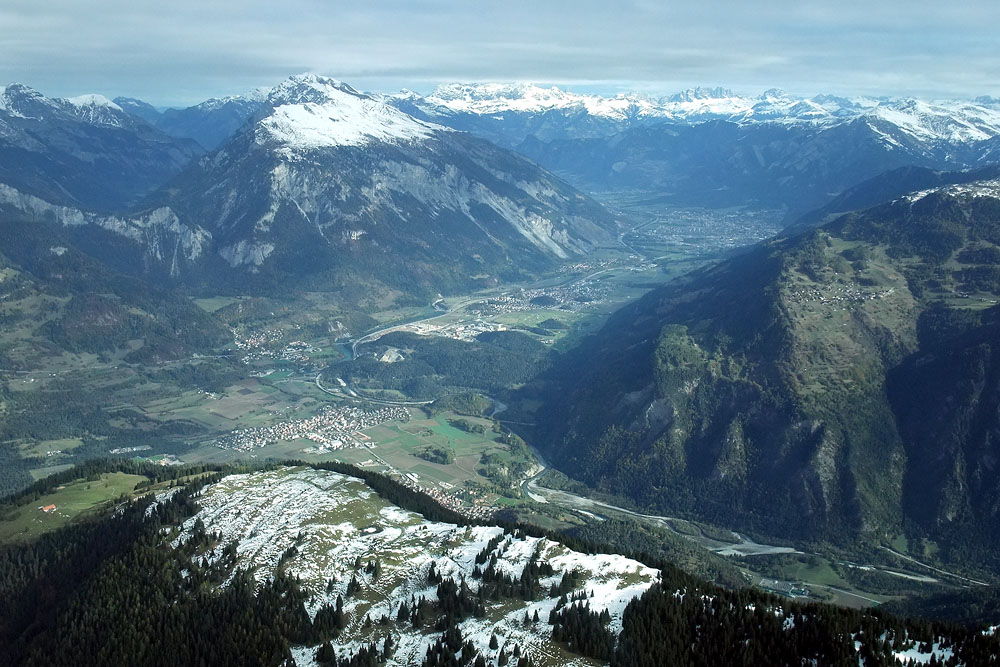 Bereits wieder ein gutes Stück weiter, nun unter einer dünnen Wolkendecke, überfliegen wir Bonaduz und Rhäzüns beim Zusammenfluss von Vorder- und Hinterrhein.